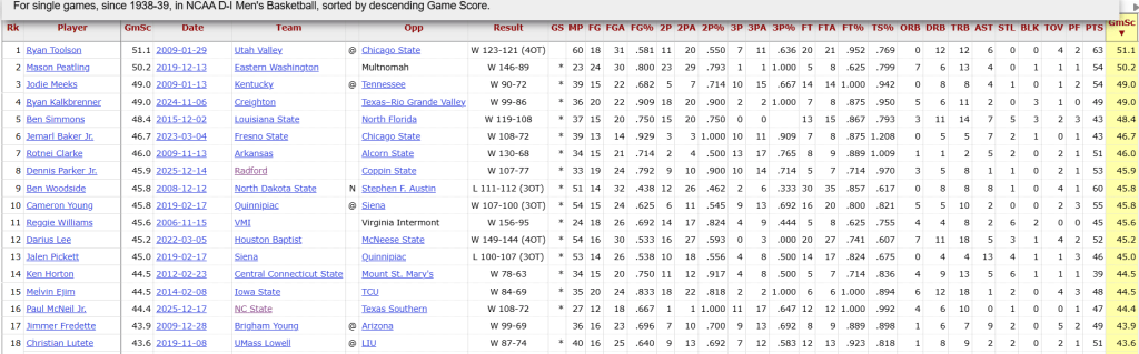 And once you strip away the noise—non-Division I opponents, multiple overtimes, and 50-plus-minute games—these two performances rise even higher. I did some estimates. 272 teams in 1982 on so on. That would equal 180–185k D1 players since 1982, and about 5.5 million player-games or opportunites. So 2 top 10 or so best in the same week in 2025.
