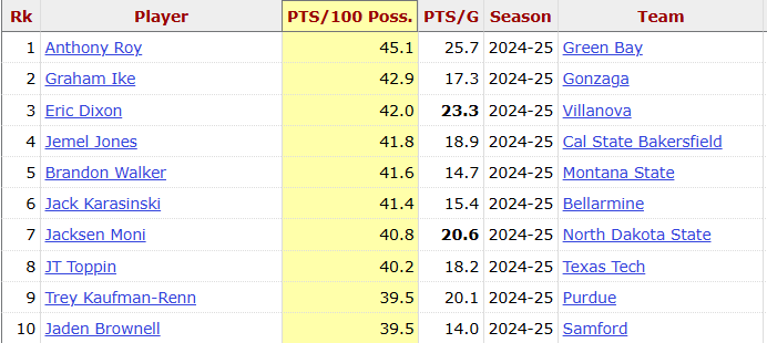Moore returns to form at Georgia Southern after a quiet year at UAB, previously showing proven scoring and playmaking as a 5’11 point guard. His efficiency and production make him the most established PG option despite some recent inconsistency. That inconsistency scares me however.